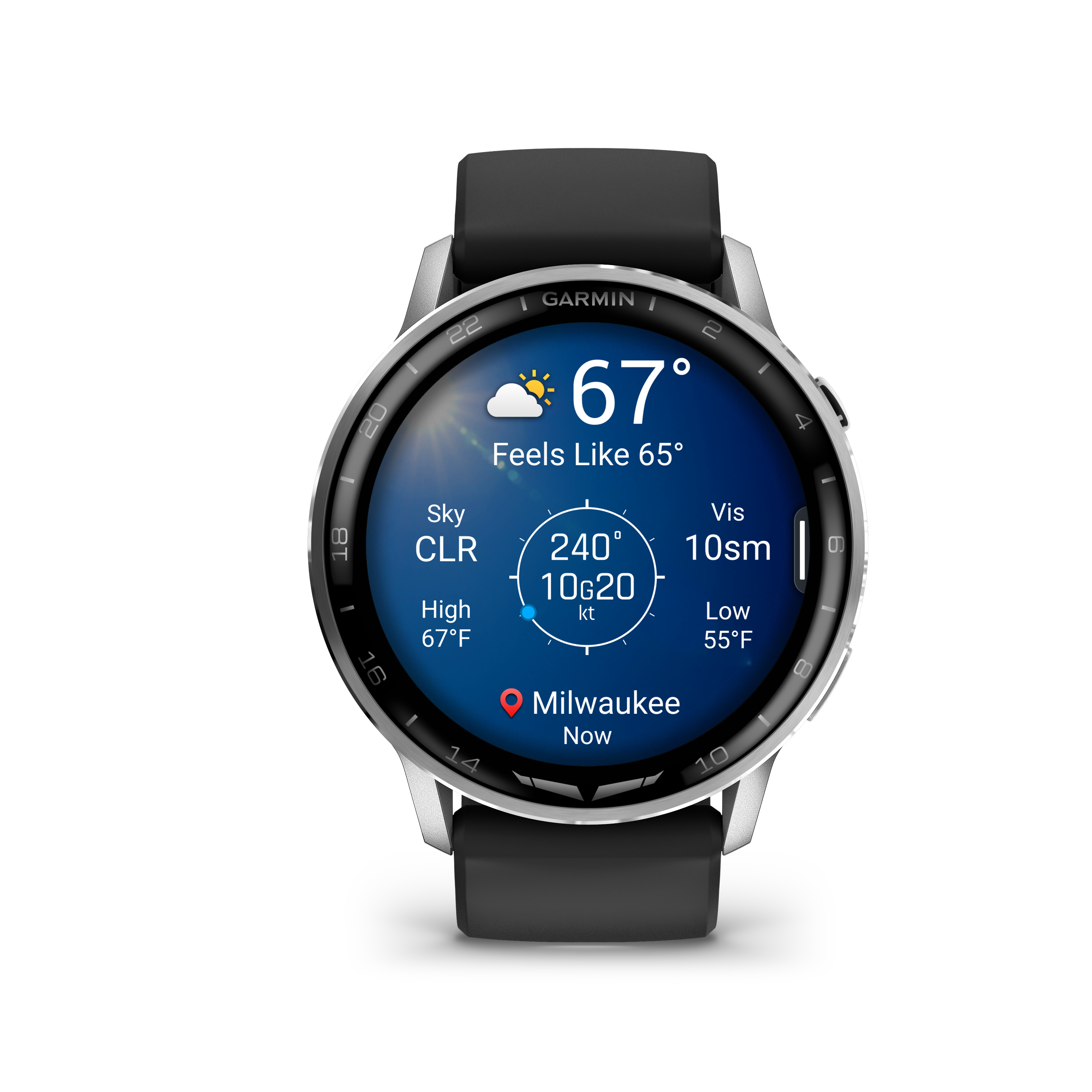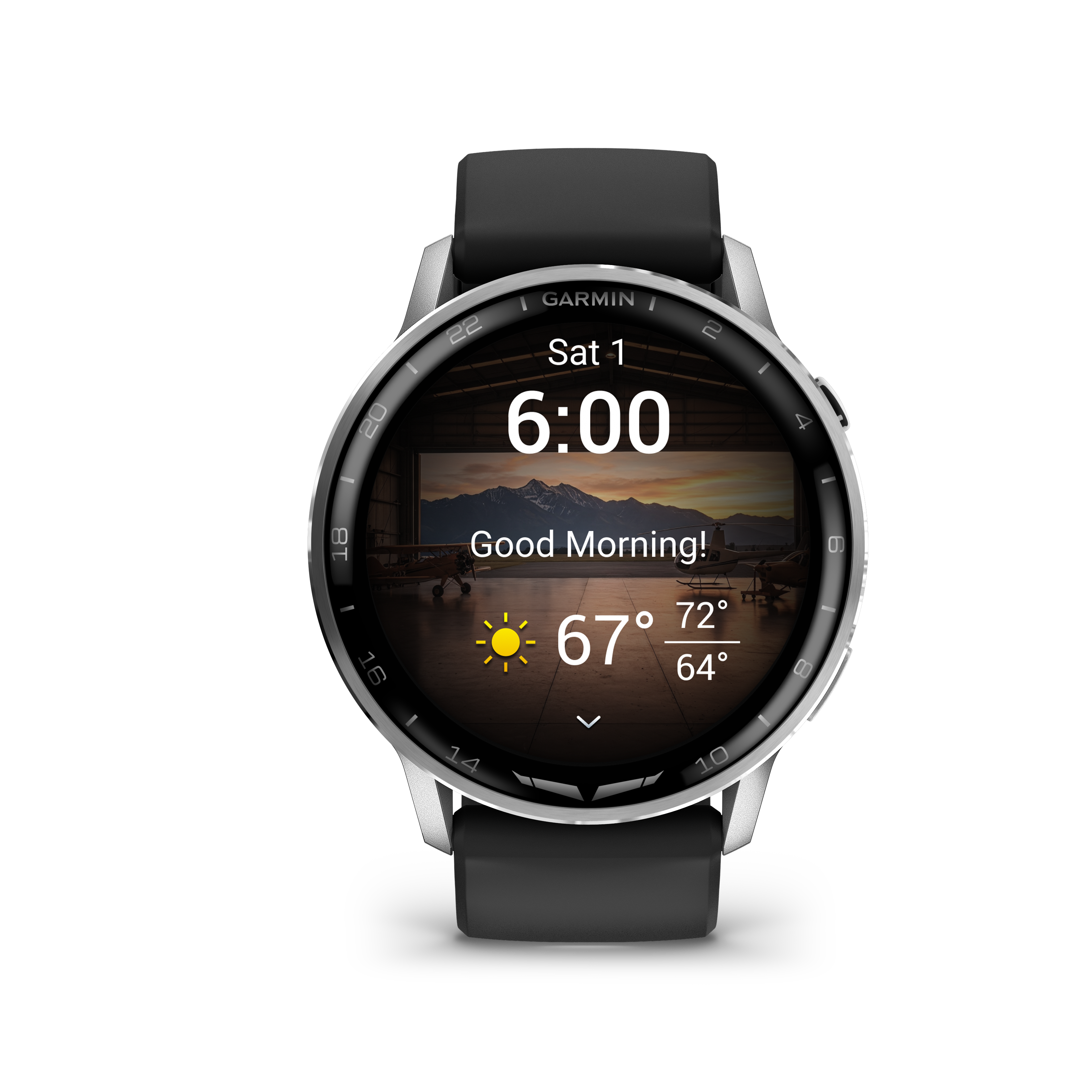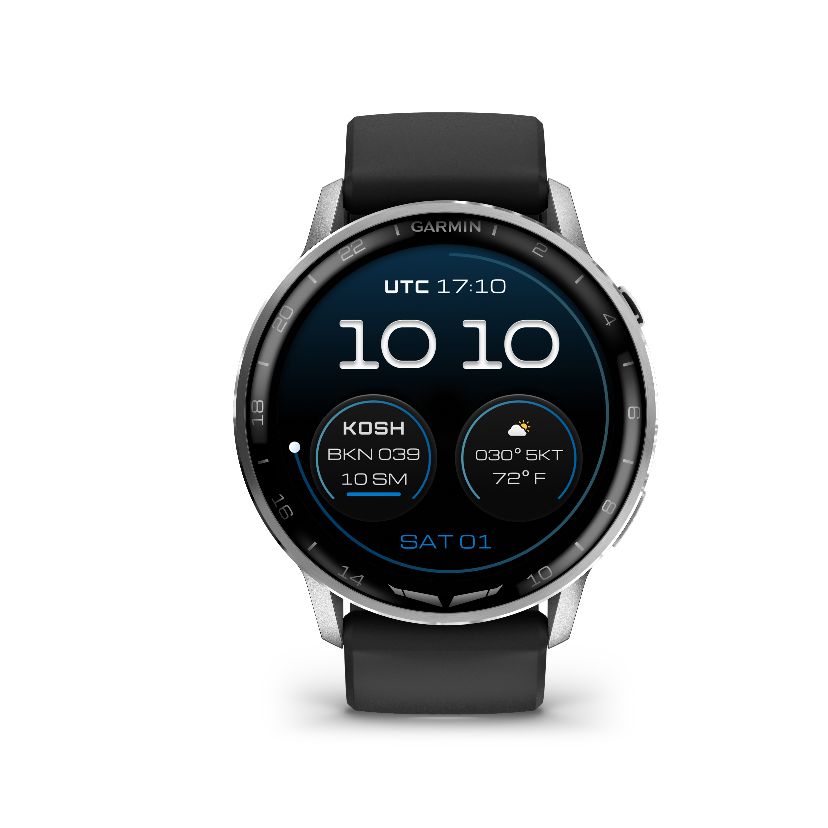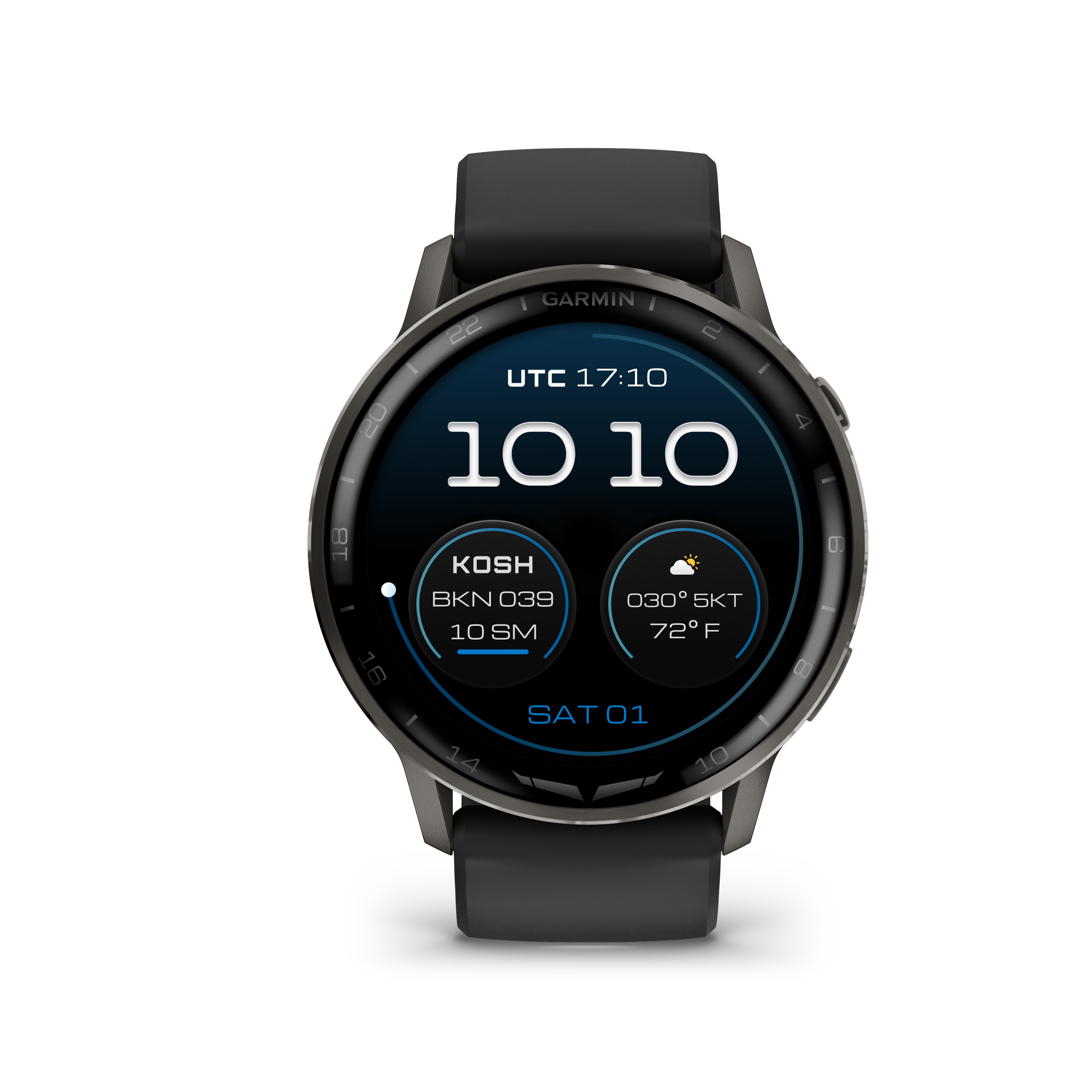 combines exclusive piloting tools — for weather, navigation and flight logging — plus advanced training, fitness and wellness features. With its bright 1.4" AMOLED display and built-in LED flashlight, the watch comes equipped for flight with an
