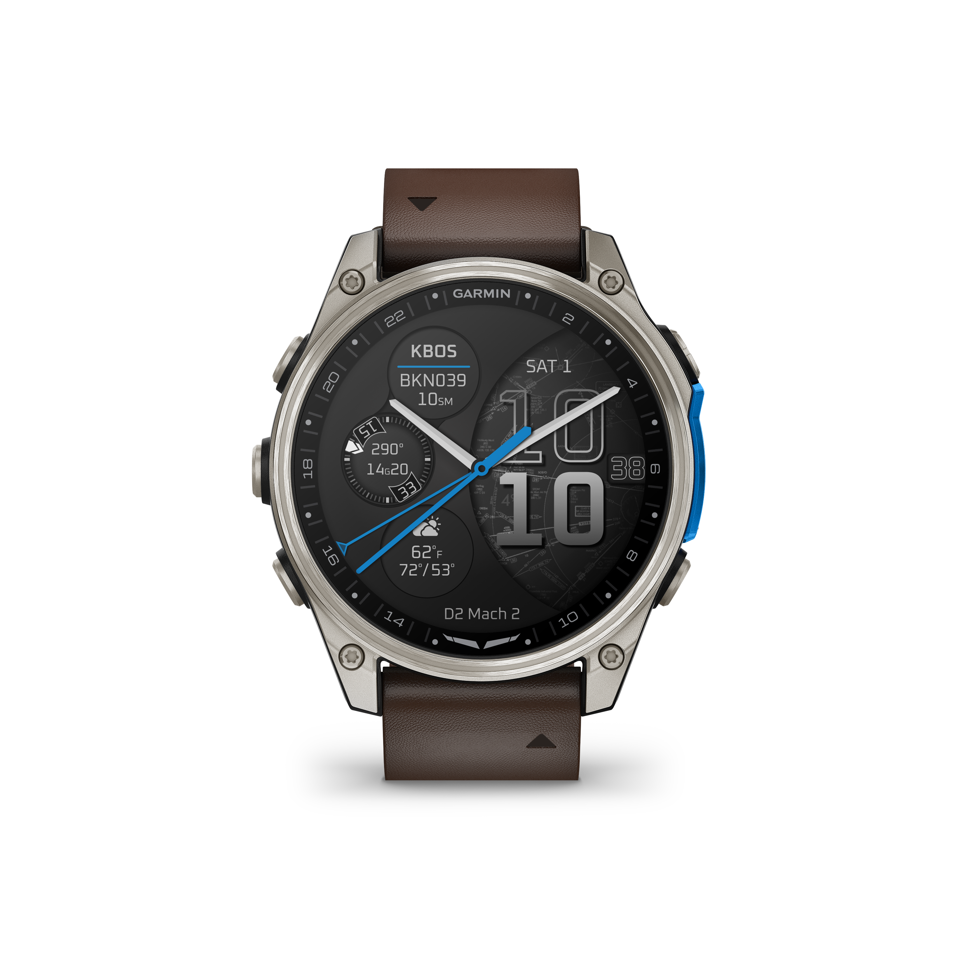 D2™ Mach 2 is the most highly evolved Garmin aviator smartwatch to date. It combines classic aviation styling with a durable titanium bezel, sapphire lens, bright 1.4" AMOLED touchscreen display, advanced flight mapping and powerful built-in LED flashlight. D2 Mach 2 has convenient tools for every phase of flight, including an on-device aeronautical database, HSI, and Direct-to navigation. Access NEXRAD, METARs and TAFs — plus set personal minimums to stay ahead of the weather (when paired with your smartphone). The built-in speaker and microphone let you make and take calls from your wrist when your watch is paired with your smartphone. Use voice commands to get METAR information, start a flight, select a destination airport and more. Advanced health and fitness features help keep you on top of your game with strength training plans, daily suggested workouts and monitoring of heart rate, respiration, stress, sleep and more (data presented is intended to be a close estimation of metrics tracked). With up to 14 days of battery life in smartwatch mode, D2 Mach 2 is powered for life on the go.